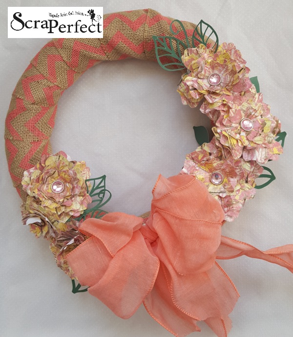 Now just layer your flowers together and add a brad in the center to hold the flowers in place.  I like to play with my flowers to get them bent into the shape I want but this is entirely up to you.  I adhered the flowers and leaves in place on the wreath by using The Best Glue Ever.