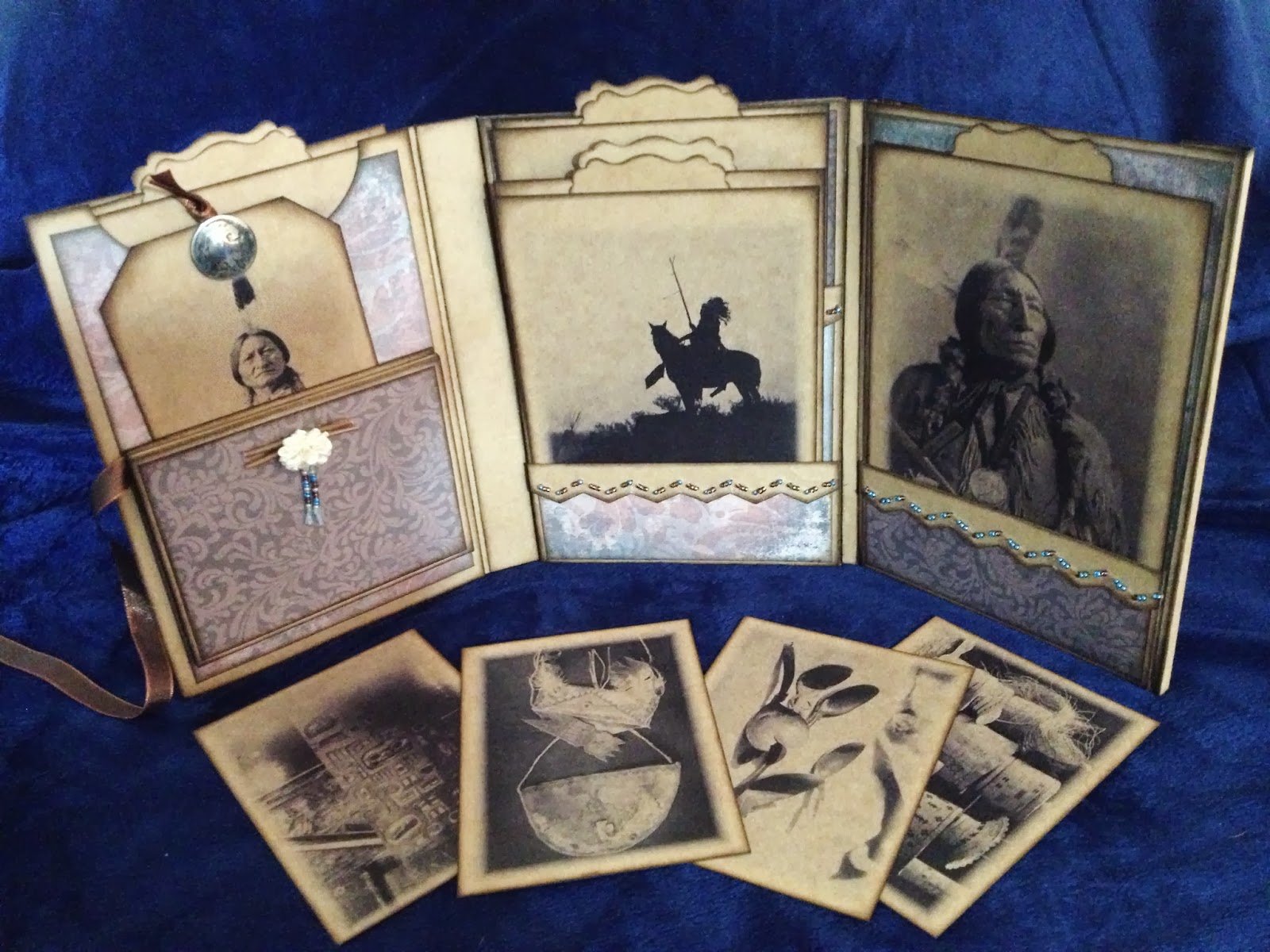 In the next email, Karen explained that she loves making mini albums which she gives away as gifts. Most of them were work related (she’s the communications coordinator for Lutheran Indian Ministries) so they are mostly Native American in style. She said she uses Smead Kraft legal-sized file folders for the construction of most of her books because it’s a very sturdy card stock with a nice finish. I asked if she’d be willing to send an image that I could post. They are GORGEOUS!