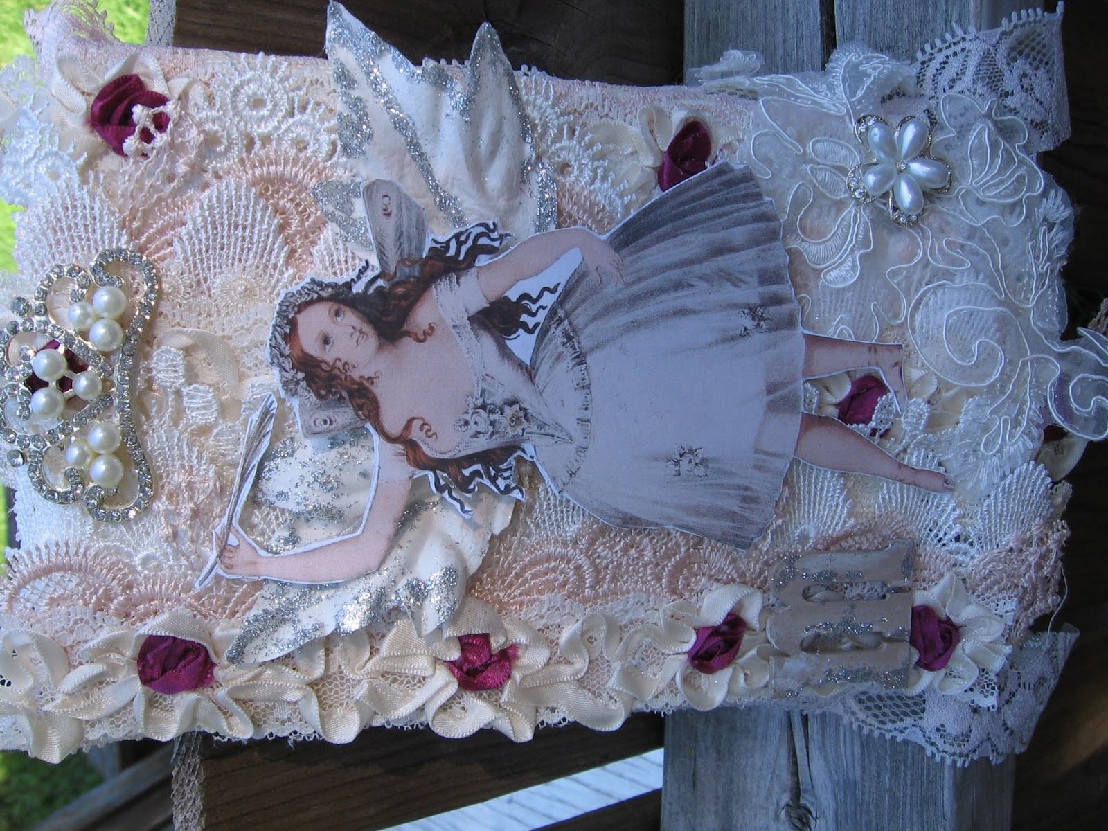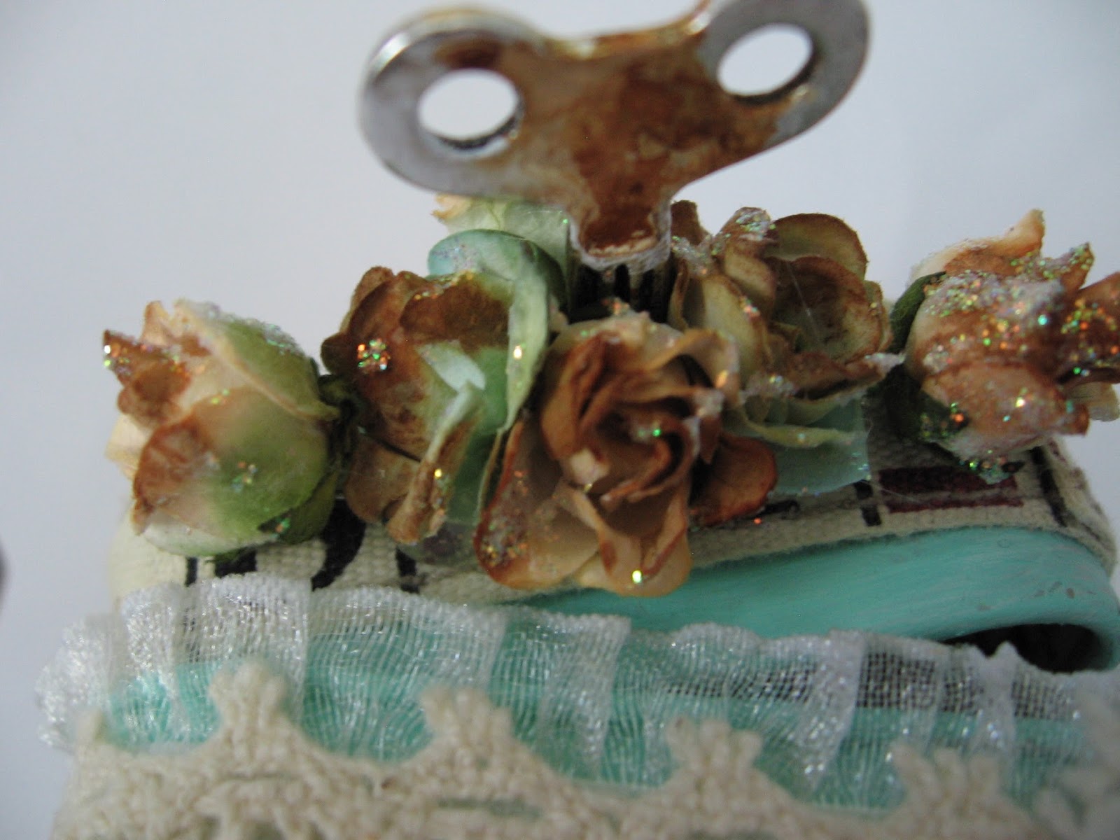 Now it was time to put it all together. I used the glue once again to attach down my laces and trims.