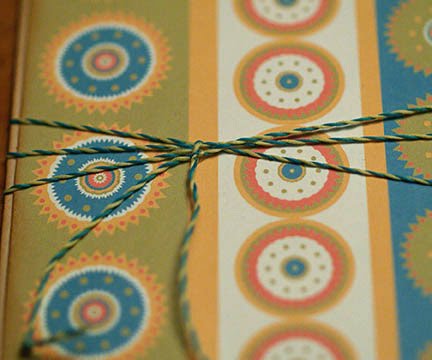 Solution: A home-made sticky dot made with The Best Glue Ever. I placed it on the front of the card where I wanted the twine to intersect , then I just started laying the twine on top of the sticky dot with each wrap.