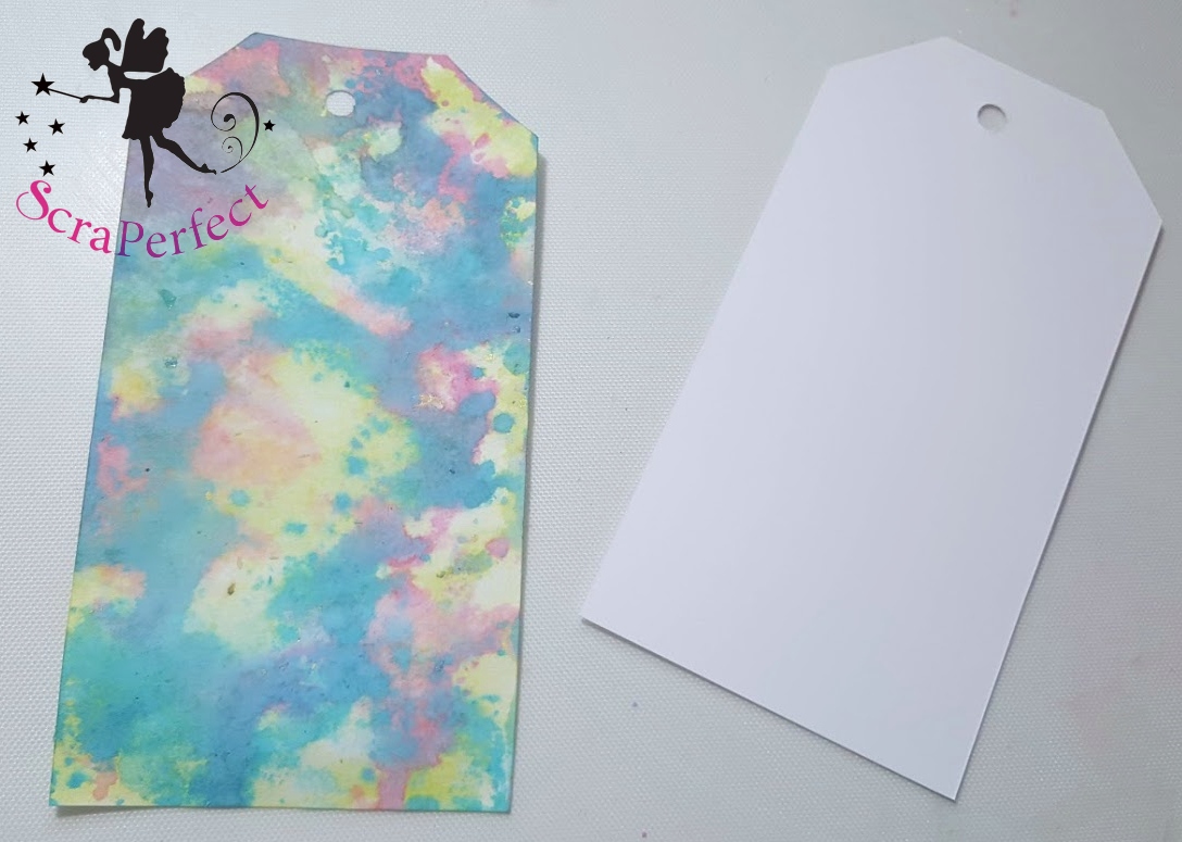 Using the ink pad directly on my craft mat, I lightly spritz the color with water, then lay the tag on top of the mix, and blotted the tag across to achieve a watercolor like look.