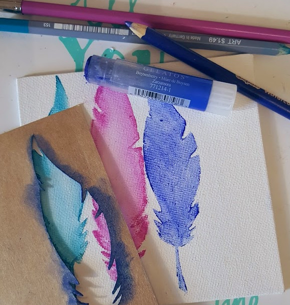 Wetting my finger, I blended the color of each feather, leaving it lighter in the center, and darker on the edges of each feather, leaving the stencil in place for each feather. For additional detail, I used watercolor pencils in coordinating color shades, to emphasize the edges of each feather.