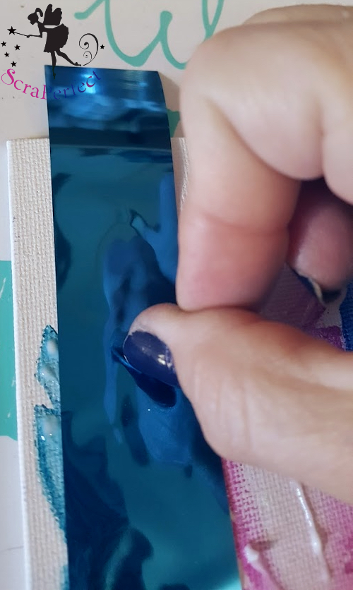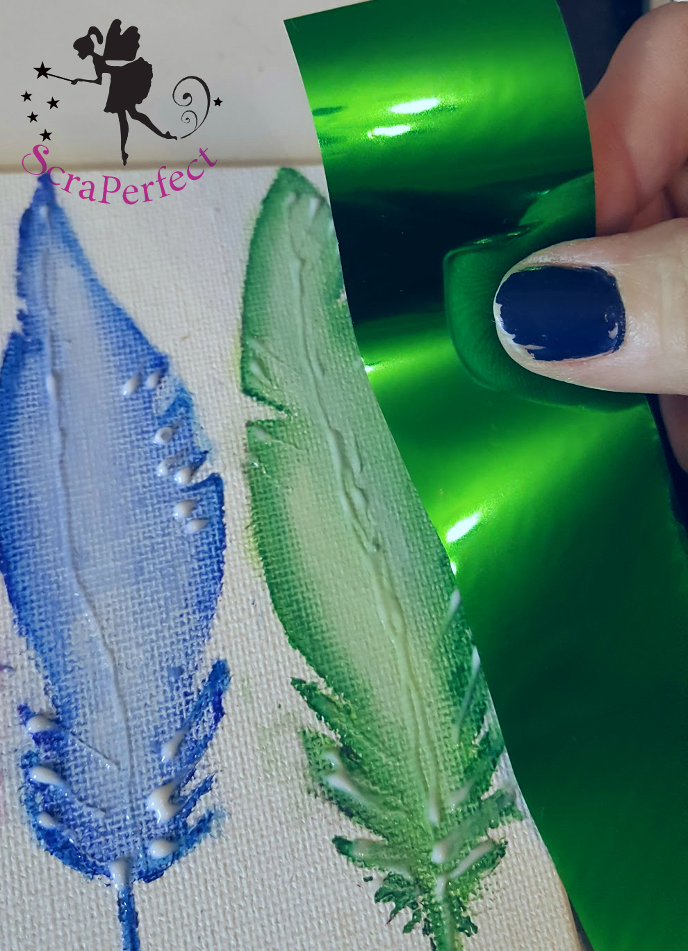 Once the tack had formed, I added coordinating colors of Transfer Foil, cut into 1-inch strips, to each feather, using only my thumb nail to