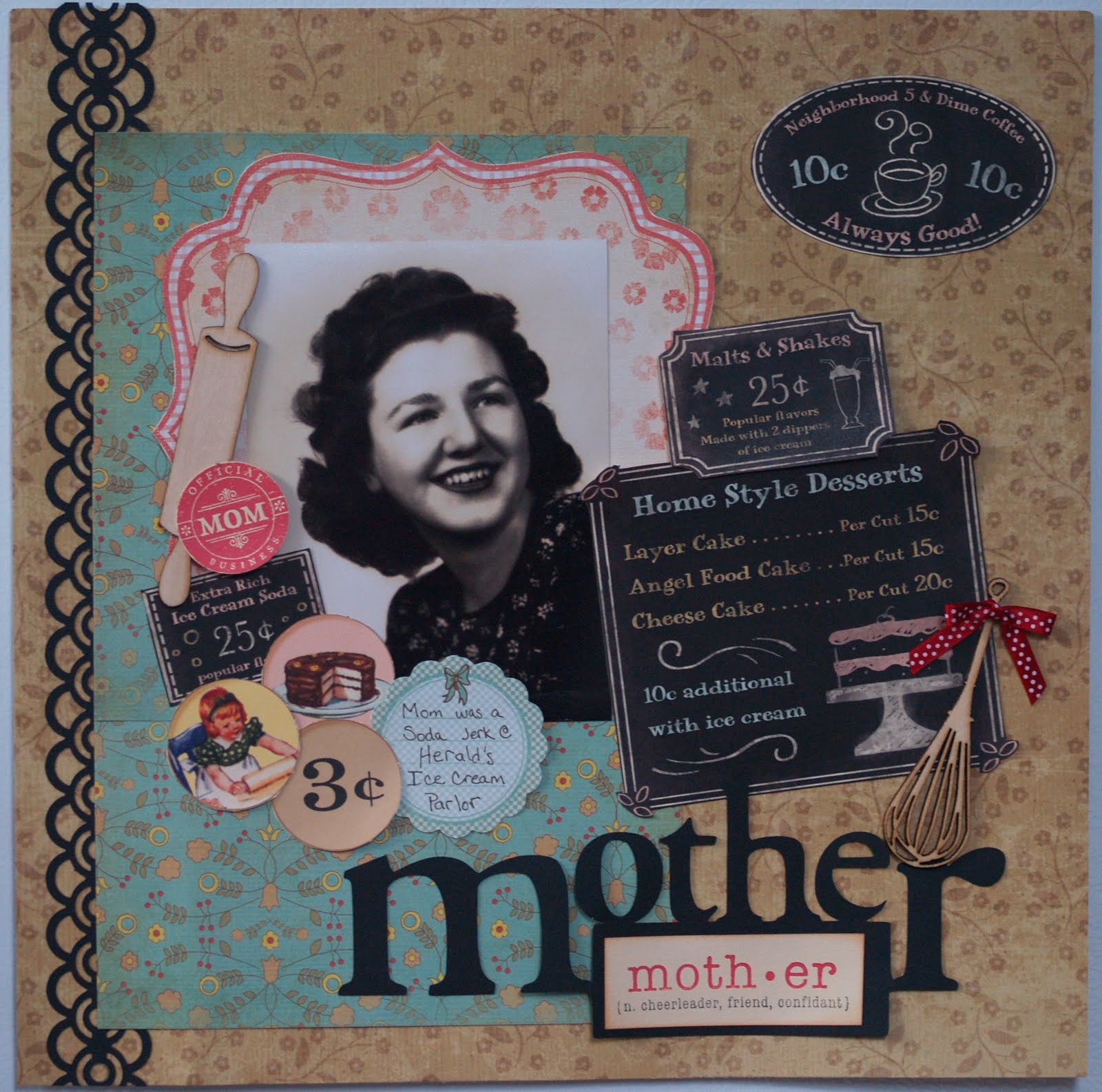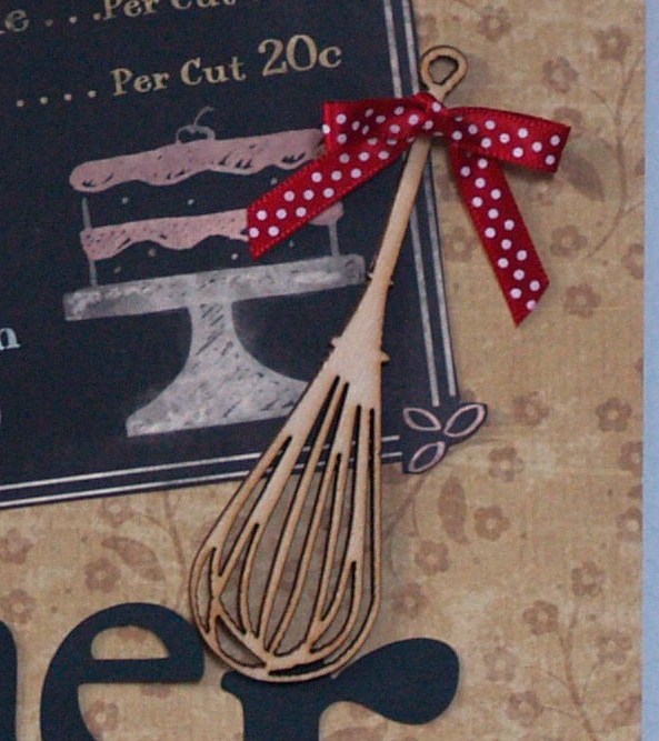 The delicately cut whisk from Kaisercraft also posed a challenge. No worries! I put a small dot of The Best Glue Ever on the handle and the “wire” part of the whisk and set it aside for a few minutes. When the glue had “dried” into perfectly-sized, clear adhesive dots, I simply flipped it over and adhered it to the layout.