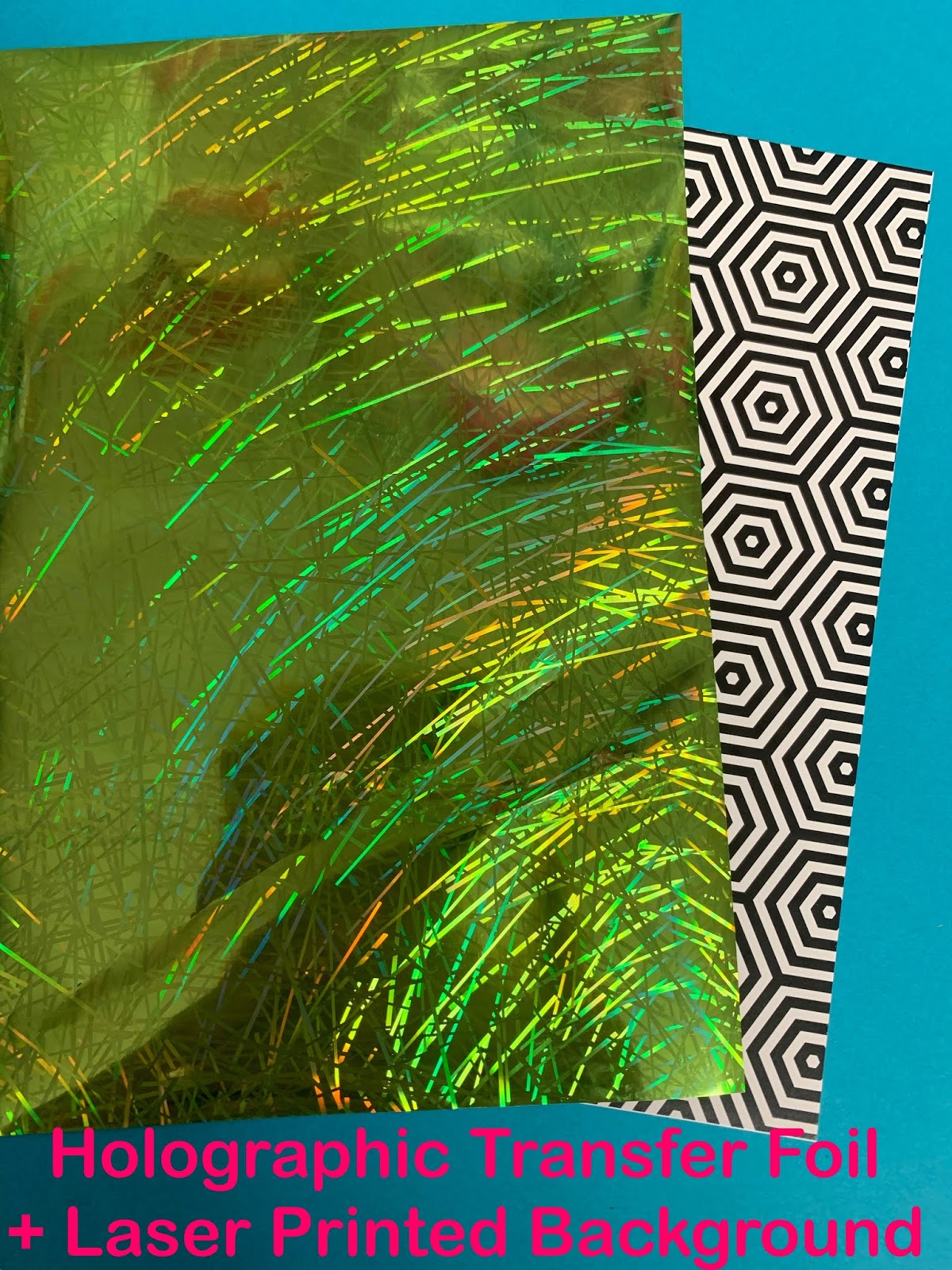 To begin, I selected the bright green holographic foil and a laser-printed background. To apply the foil, simply place the foil (shiny side up) on top of the laser-printed cardstock. Run through a heat laminator (I just use a cheap-o one and it works just fine). Remove the foil and your laser image is now shiny and beautiful!