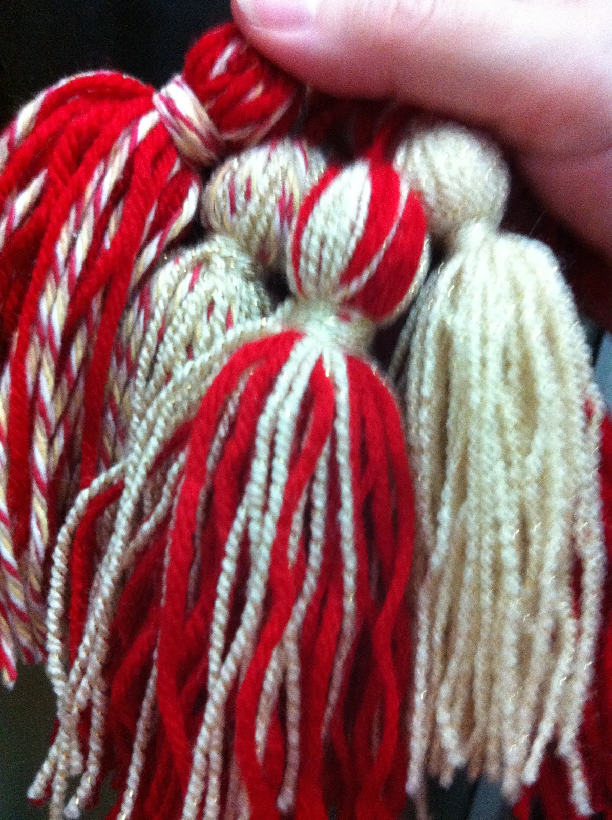 While waiting for the medium to dry, I enjoyed spending some time making a bunch of yarn tassels. I used assorted red, striped and sparkling yarns, wrapped around a Nintendo DS game box – slightly smaller than a DVD box, and exactly the right proportion. I filled the holes I had previously drilled with Best Glue Ever, then stuffed the trimmed cord of a tassel into each, working it into the hole with my tweezers and the pointy end of the EG stick. Finally I screwed in a tiny eye hook for hanging.