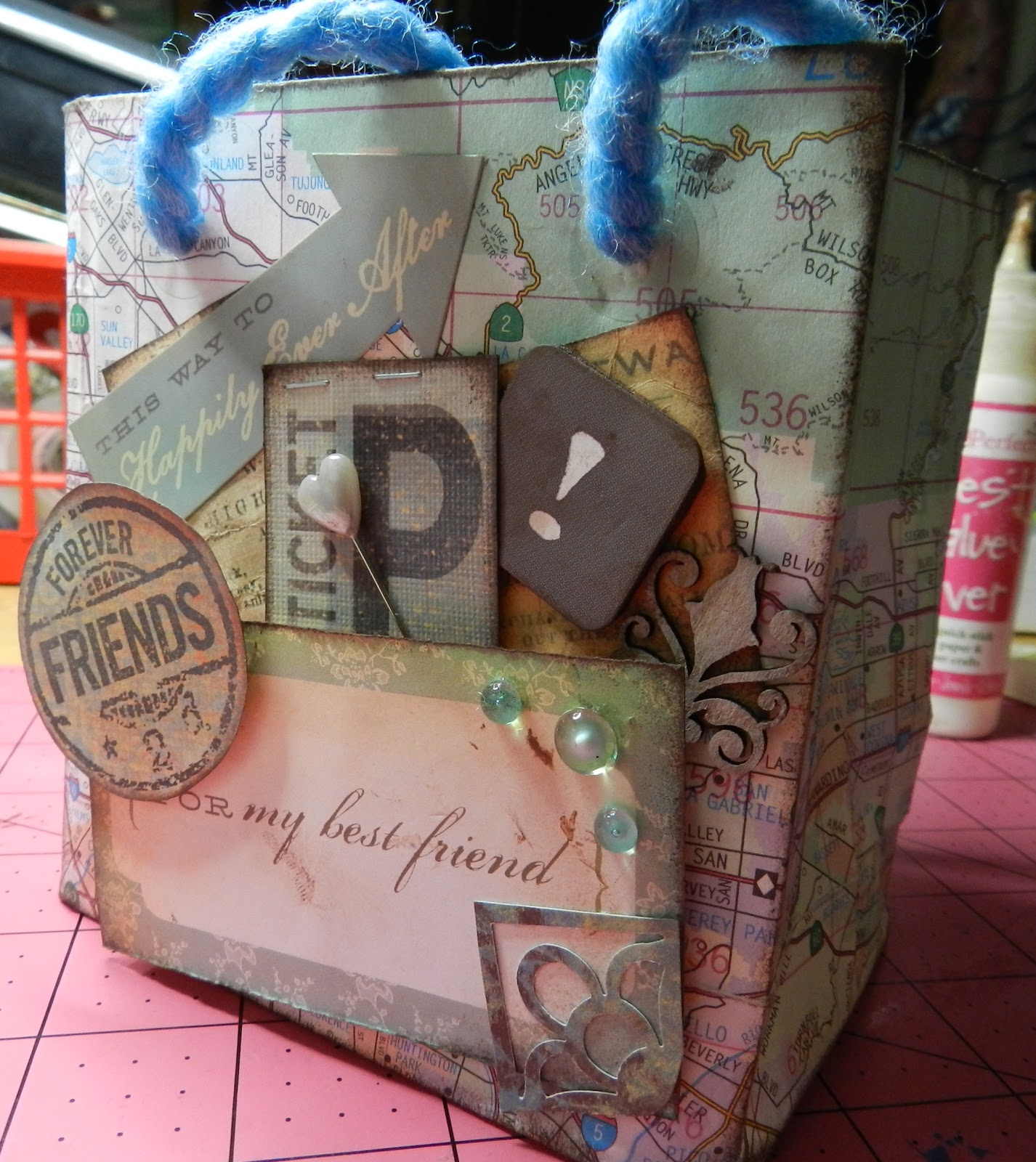 Here is a folded paper Gift Bag following the instructions in this blog. In this case, instead of using newspaper (mostly because I don’t get any), I used an old map of Los Angeles County. Like the blog instructions, I made it two ply. I used Best Glue Ever for the paper and embellishments. Next I decided it needed more decoration, so a I inked some ephemera (dried with the Perfect Crafting Pouch), stamped an image for a “coin”, and layered it on to the front. I placed Dew Drops with Embellie Gellie. The handles are some coordinating thick yarn, knotted inside. I reinforced the holes with clear circular reinforcements.