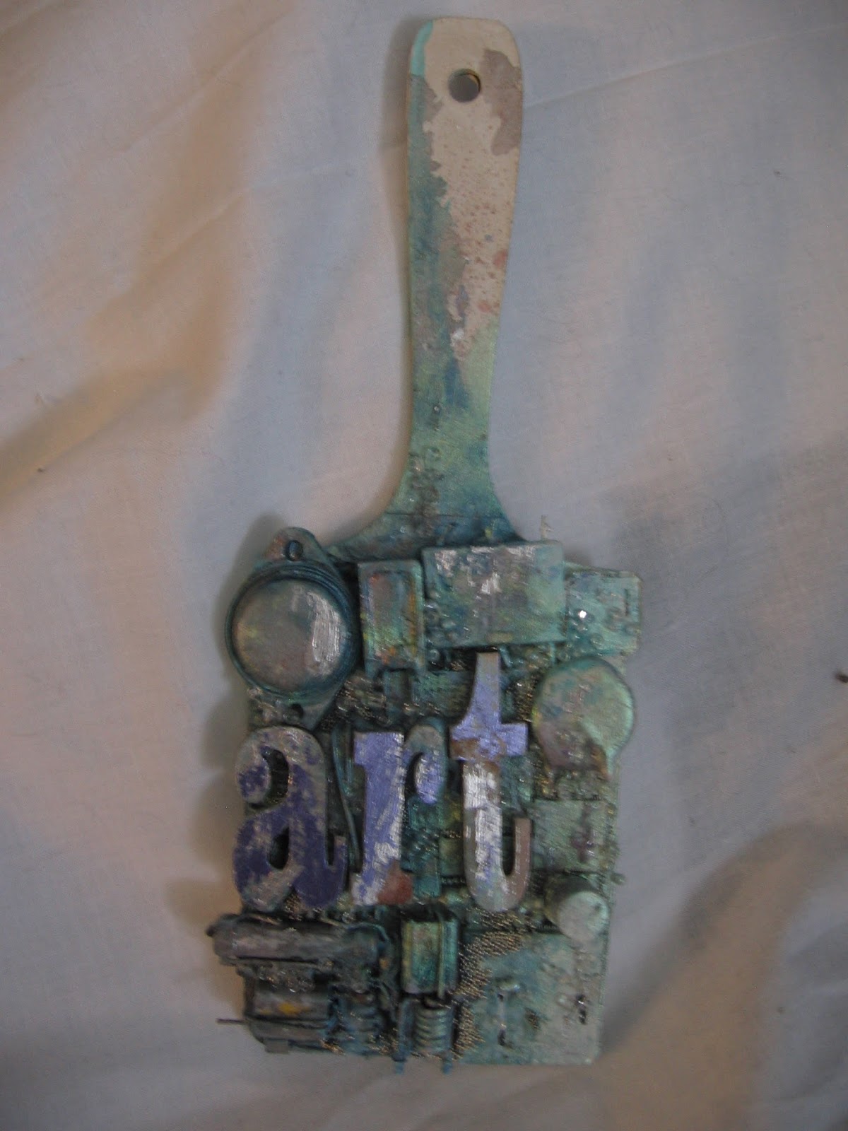I set the brush aside to dry and now I will work on the letters for the front of the brush. The letters are also wooden, and from Fernli Designs. I gave them the same spray treatment and then used BGE again so that I could use some of the Transfer Foils from ScraPerfect.