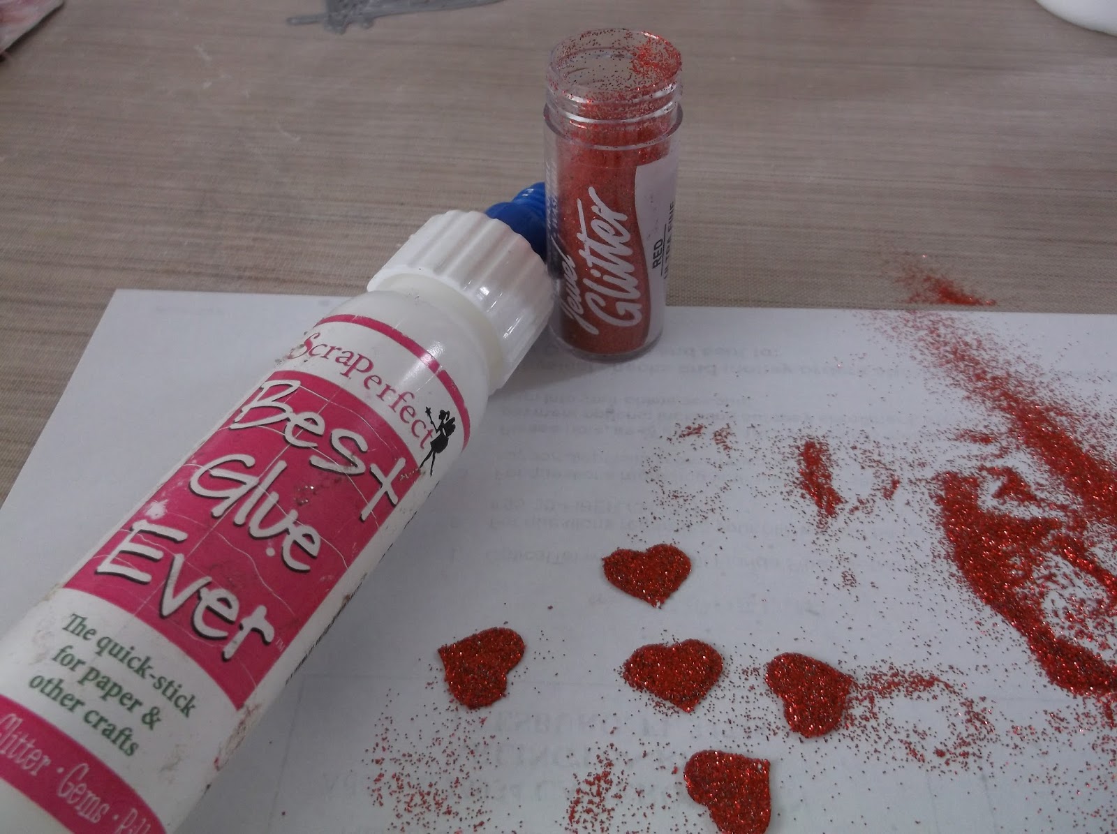 Next came some glittery little hearts. I punched out several hearts and covered them with some of the Best Glue Ever and then sprinkled red glitter over them. I pressed the glitter into the glue with my finger and let them dry.