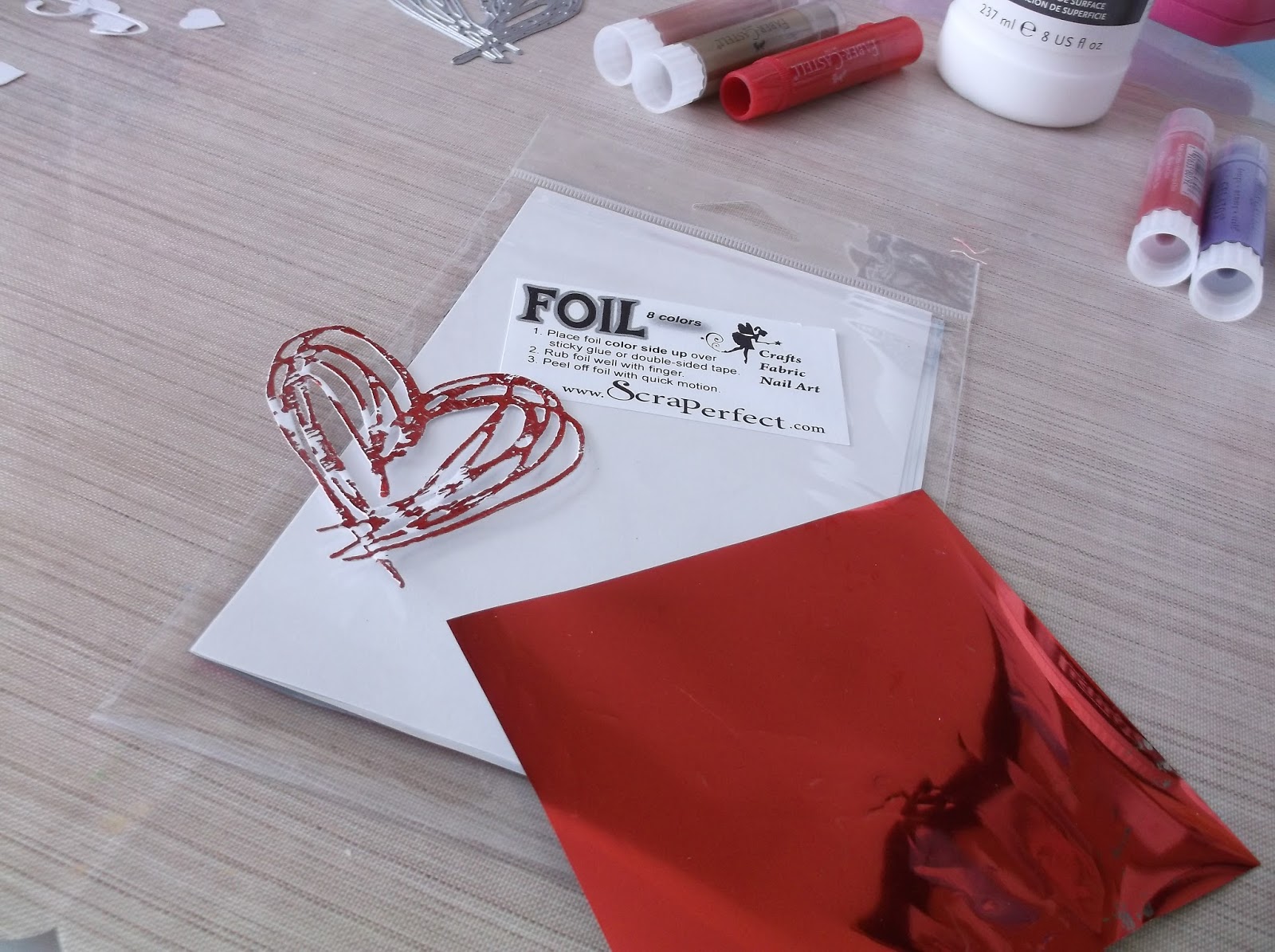 I made a die cut heart out of white paper and then used some red Transfer Foil on it. It’s so easy! Just add a thin layer of the Best Glue Ever and let it dry til it’s clear and tacky. Then lay the foil on top of the glue and rub the foil with your finger to get it to adhere to the glue. Pull the foil off and you have a beautiful shiny embellishment. I wanted mine to look distressed so I didn’t apply glue to the whole heart so some parts were left white and then added some gelato to those areas.