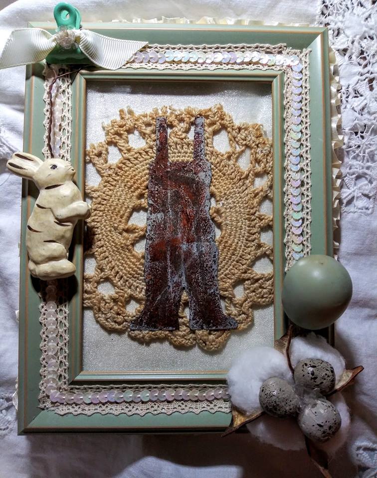 To begin. I measured and cut the cream crochet ribbon and ivory sequin trim and set them aside. Then I applied small dots of the Best Glue Ever along the turret on the perimeter of my mint green photo frame. I applied the crochet ribbon while applying gentle pressure and repeated the process with the sequin trim. I took the back of my frame off and attached ivory organza to the inside with the Best Glue Ever. I made medium sized glue dots from the Best Glue Ever and used them to secure the tea dyed doily to the organza. This was also done with the rusty overalls, which I swiped with a beige ink pad to give a distressed feel. Whenever I am working with the Best Glue Ever, I keep a small No Clog Writing Cap on my bottle for precision and to reduce the amount used since a little goes a long way!