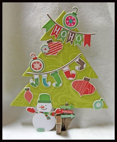 Now would be the time to ink the edges if you would like before trimming the tree. Next it’s time for the fun part….decorating. I used some super fun chipboard stickers on the tree and added some to the base as well.