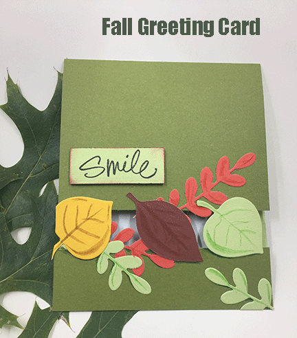 This fall card is a size A2 which when folded is 4.25″wide x 5.5″tall with the fold at the top. I wanted to make a card that had a slight see-through window. Notice the white showing through the leaves. Here is the process I used.