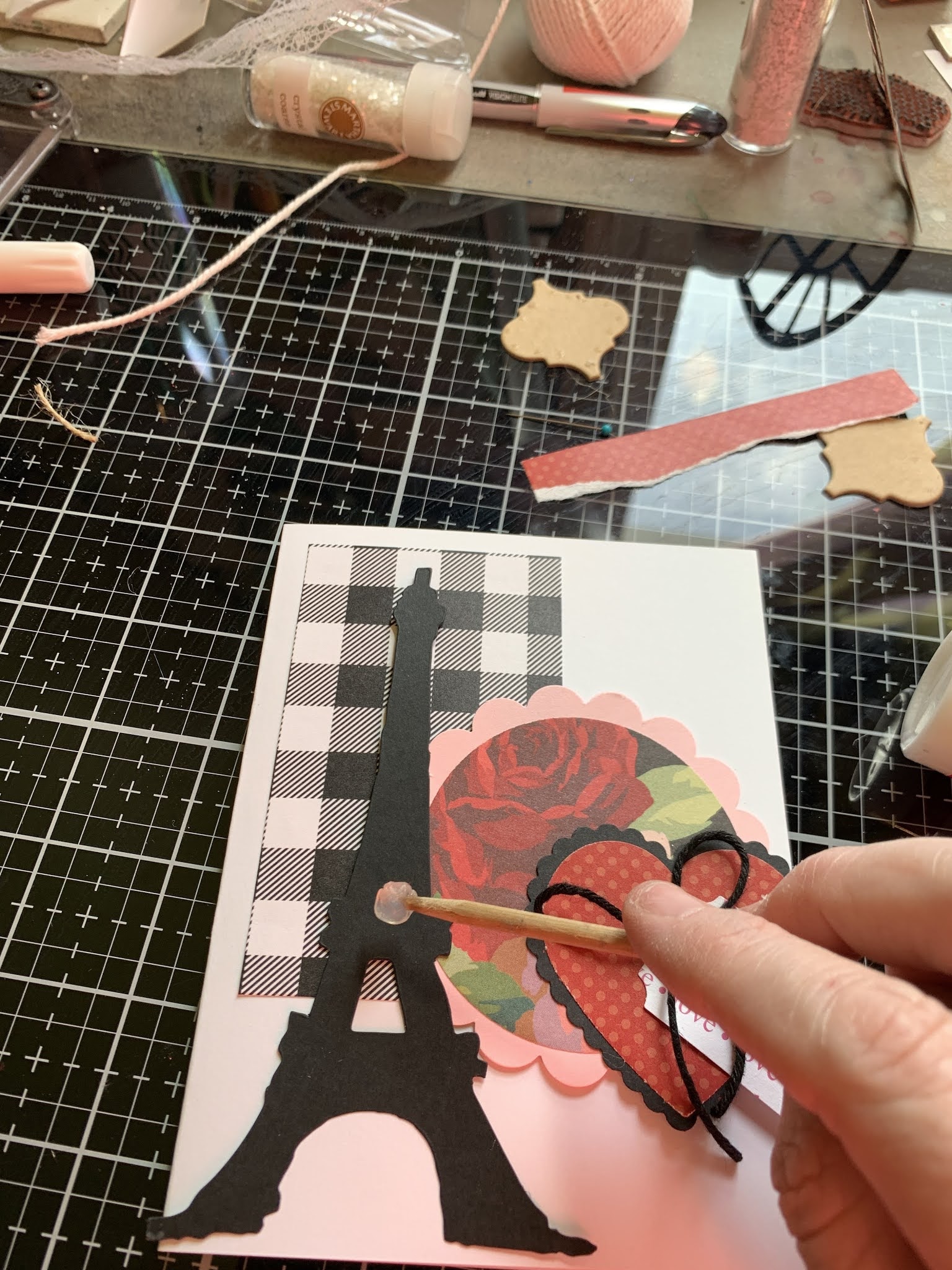 Then use ScraPerfect’s Embellie Gellie to transfer to die cut to your card. Just press down then lift up and your die cut is where you want it!