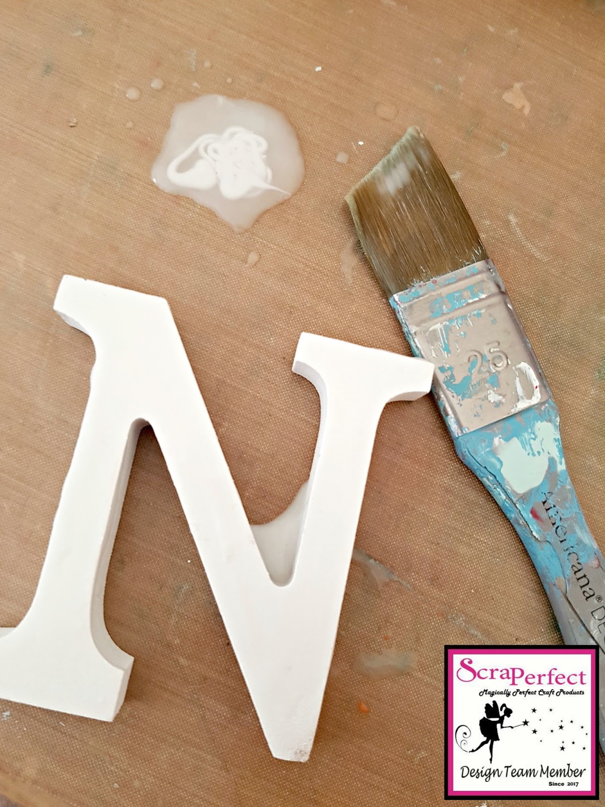 Leave it to dry and then use Best Glue ever to cover the letters with gems and pearls. Best Glue Ever sets tacky so really small embellishments stay stuck and do not drop off once the glue starts to dry.