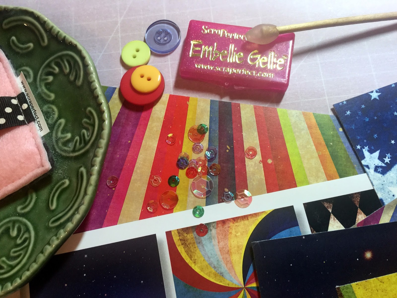 Sequins, buttons and even my die cut letters were easily placed with precision using Embellie Gellie.