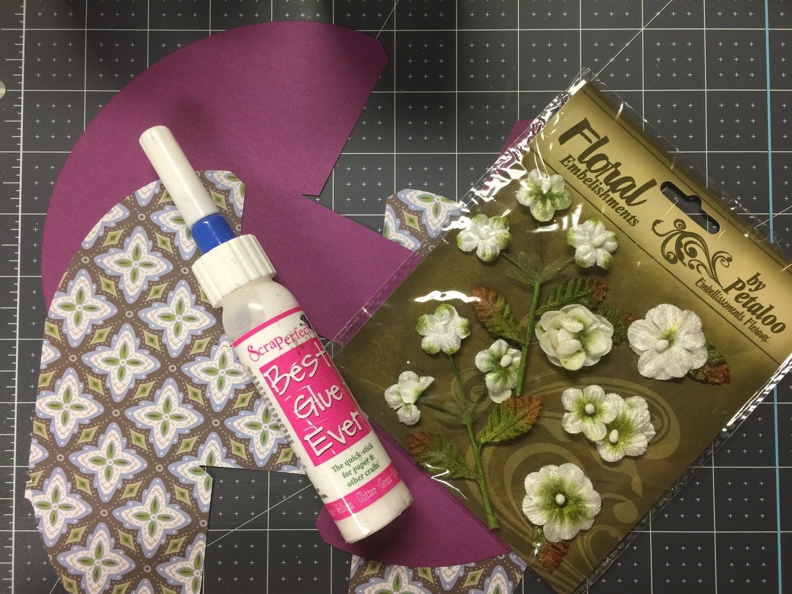 gluing the flower embellishment with ScraPerfect’s Best Glue Ever ™