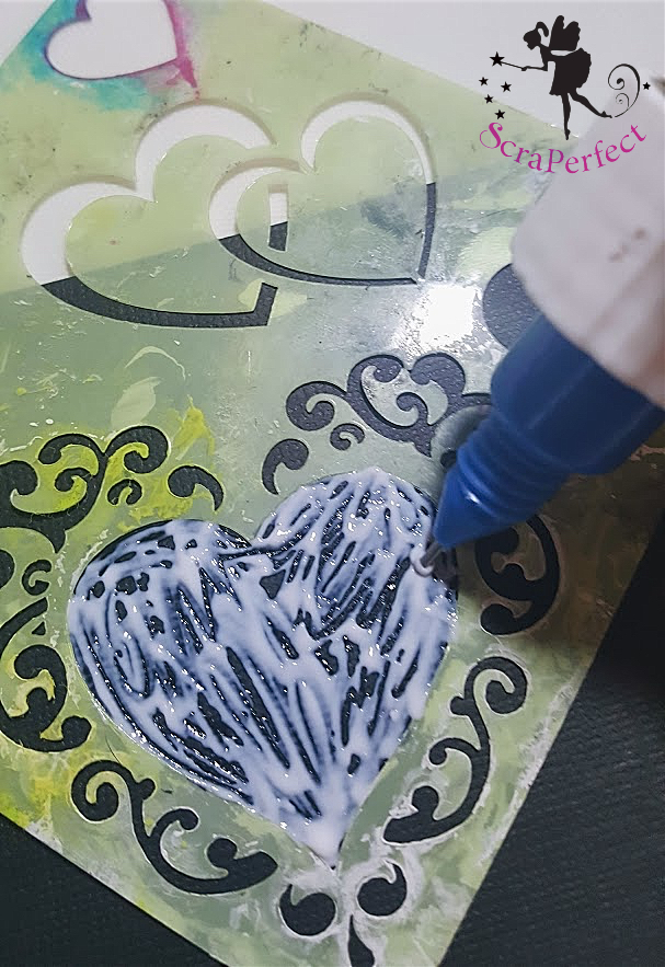 Holding the stencil firm on the cardstock, I used the Best Glue Ever with a No-Clog Writing Cap, and filled in the design, being careful to raise the stencil once complete, trying not to smudge the glue design.