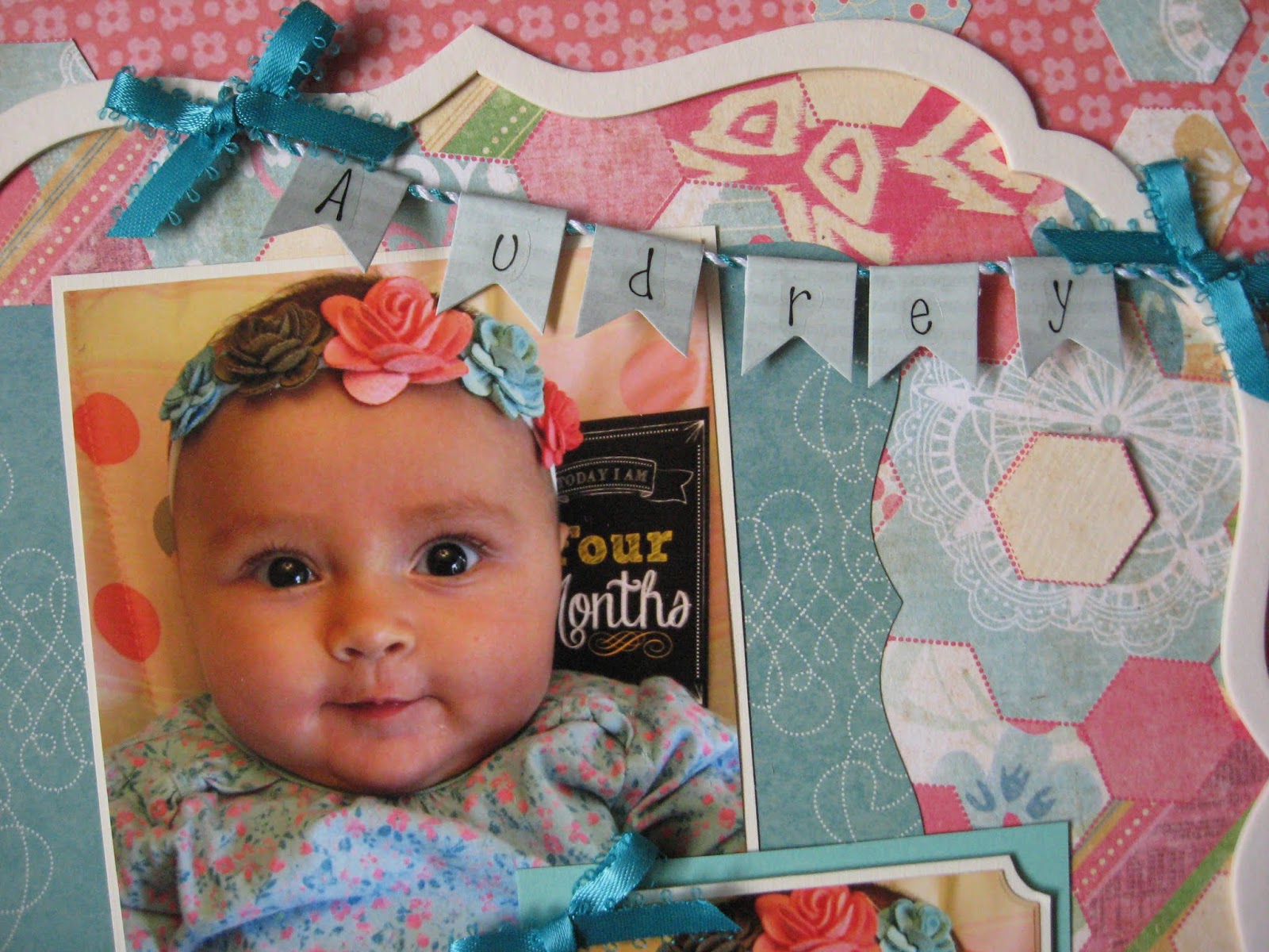 6.   Add a title to the lower left corner slightly overlapping the frame.  Next, assemble a string of bunting flags onto baker’s twine and embellish the layout. Add small alphabet stickers to the flags to personalize.  Adhere ribbon bows at each end.