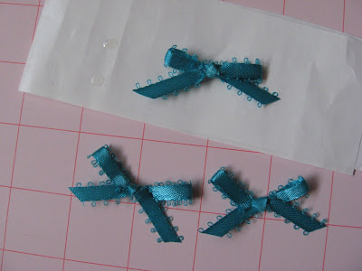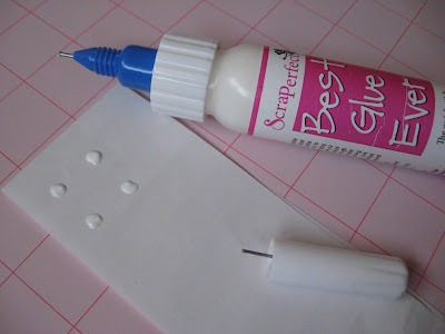 5.  Next, easily create your own glue dots by applying Best Glue Ever to a sheet of release paper. (aka the waxy paper that stickers/labels come attached to.)  Set aside to dry for 5 minutes.  Tie 4 small bows with 1/8″ ribbon and trim the ends neatly.  When the dots turn from white to clear, they are dry and ready to use.  Add a ribbon bow to each glue dot.