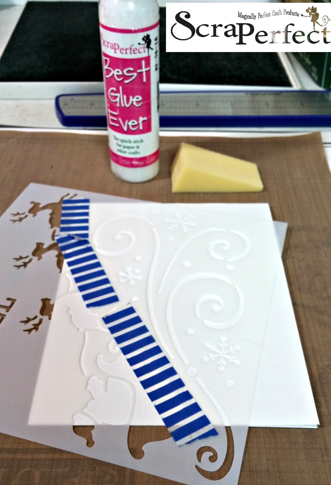 This stencil also had Santa with his sleigh on it, but I only wanted to use the snowy swirly part, so I taped off the sections I didn’t want to use with some washi tape before laying it over top of my A2 sized white card front. I then lightly sponged on the Best Glue Ever, making sure not to move the stencil.