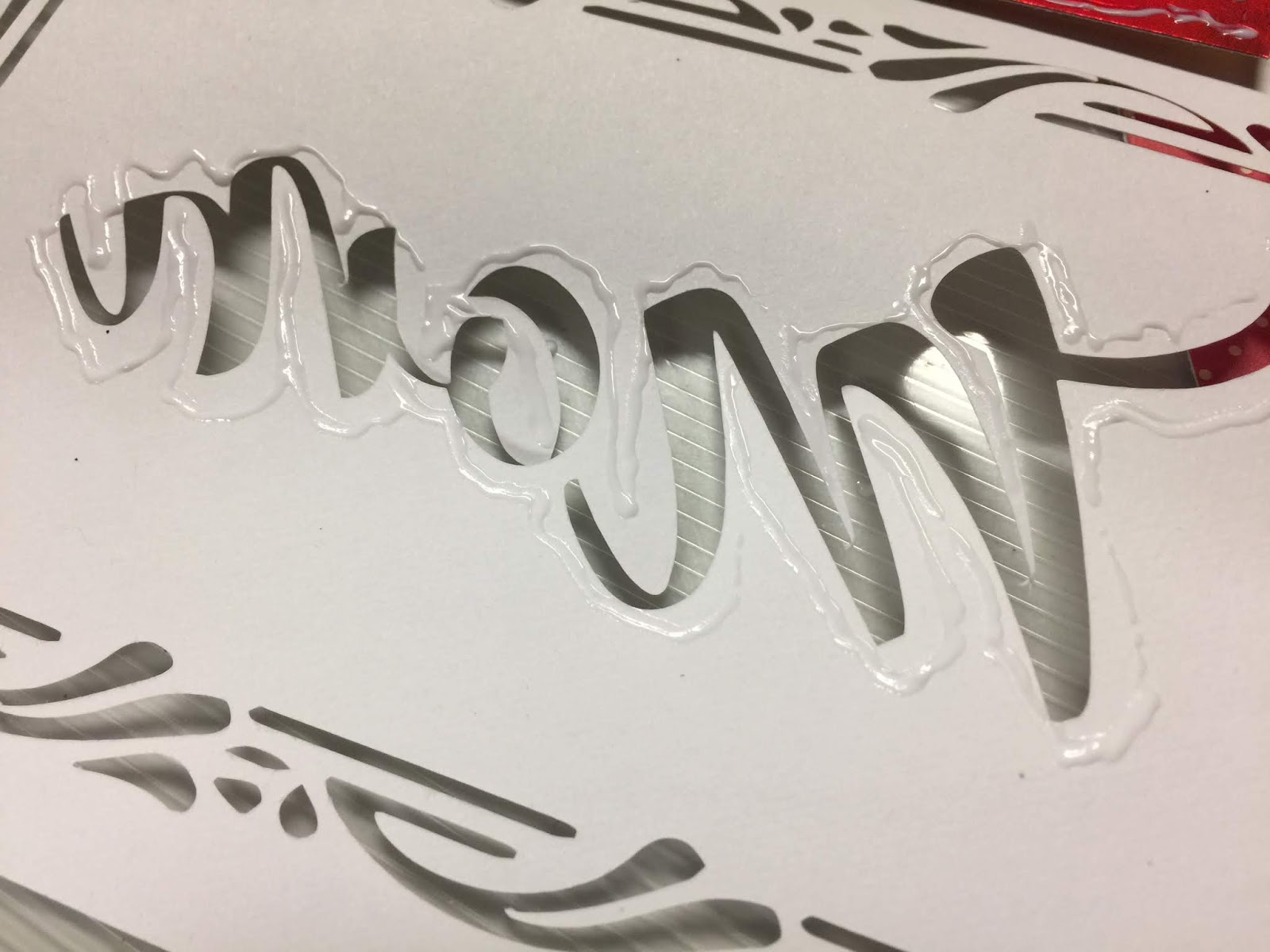 I was making the above card for a Mother’s Day craft challenge. There are three layers to this card. The white cut outside cardstock, a layer of Rinea foil paper under the word Mom, and the layer of polka dotted scrapbooking paper inside the entire card. I wanted to add the foil paper for a bit of shine and sparkle but I needed it to adhere along the cut shapes of the word.
