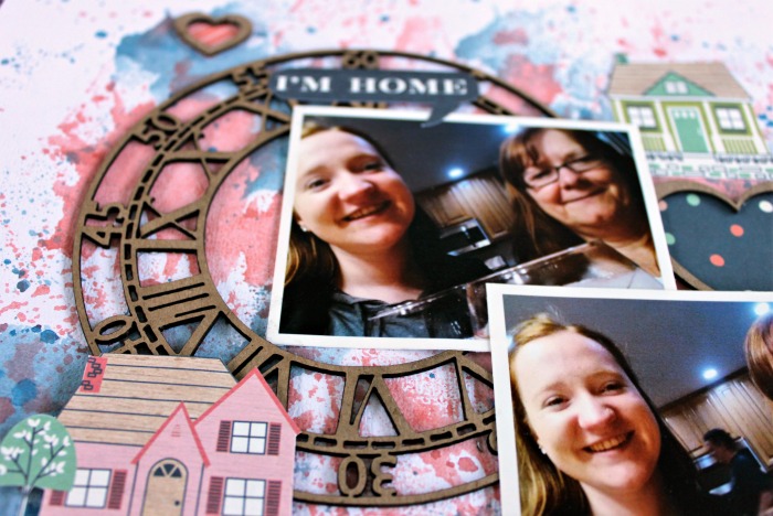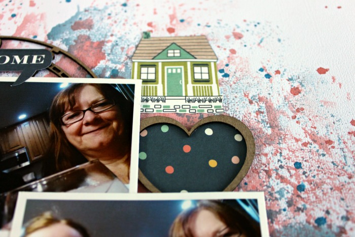 Here you can see one of the chipboard hearts backed with patterned paper. Did you notice that you can’t see any glue? That’s what I mean when I say these 2 products are awesome! If you would look at some of my older layouts, before ScraPerfect, you would definitely see glue.