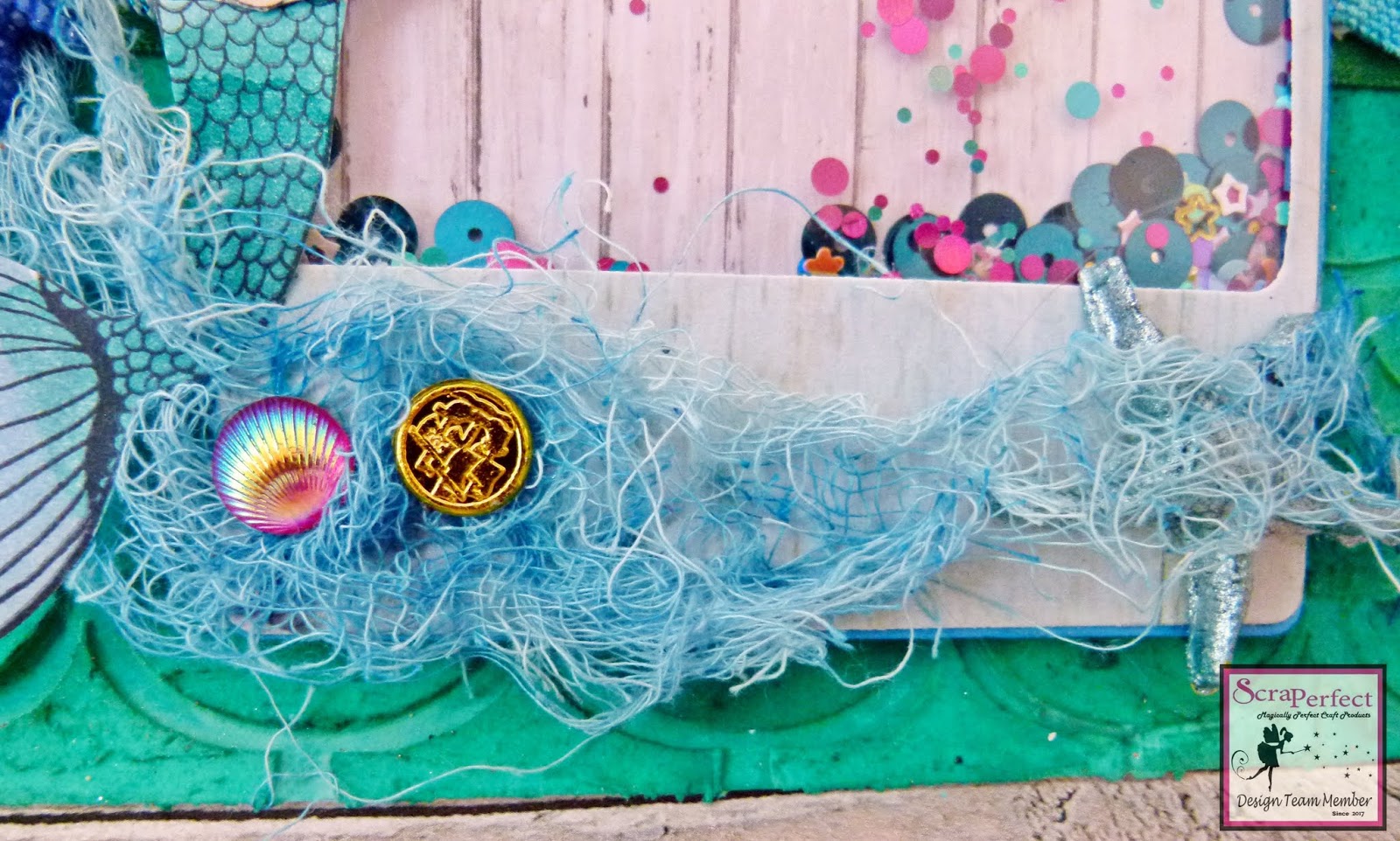 Glue down the shaker box and then add some dyed cheese cloth around the edge. Stamp out a mermaid and colour it in before adding it to the card.