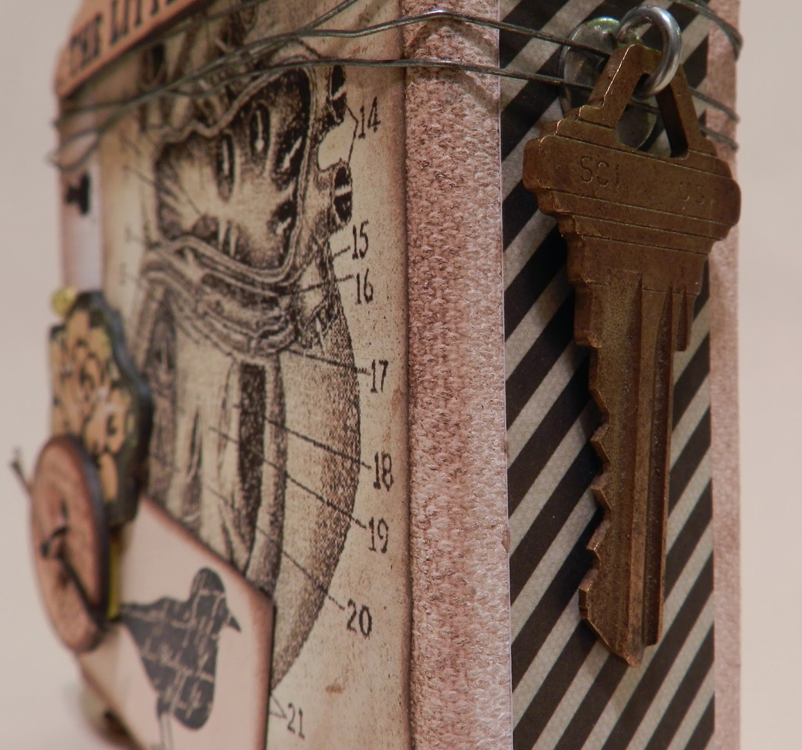 Then I placed Dew Drops with the Embellie Gellie. The borders are some striped paper cut into strips. I pushed some upholstery tacks raised with small washers into the bottoms as feet, and then used various hardware fittings and galvanized wire to finish the decorating. I think my favorite is the forest of nails wound with wire, but the hanging key is nice too.
