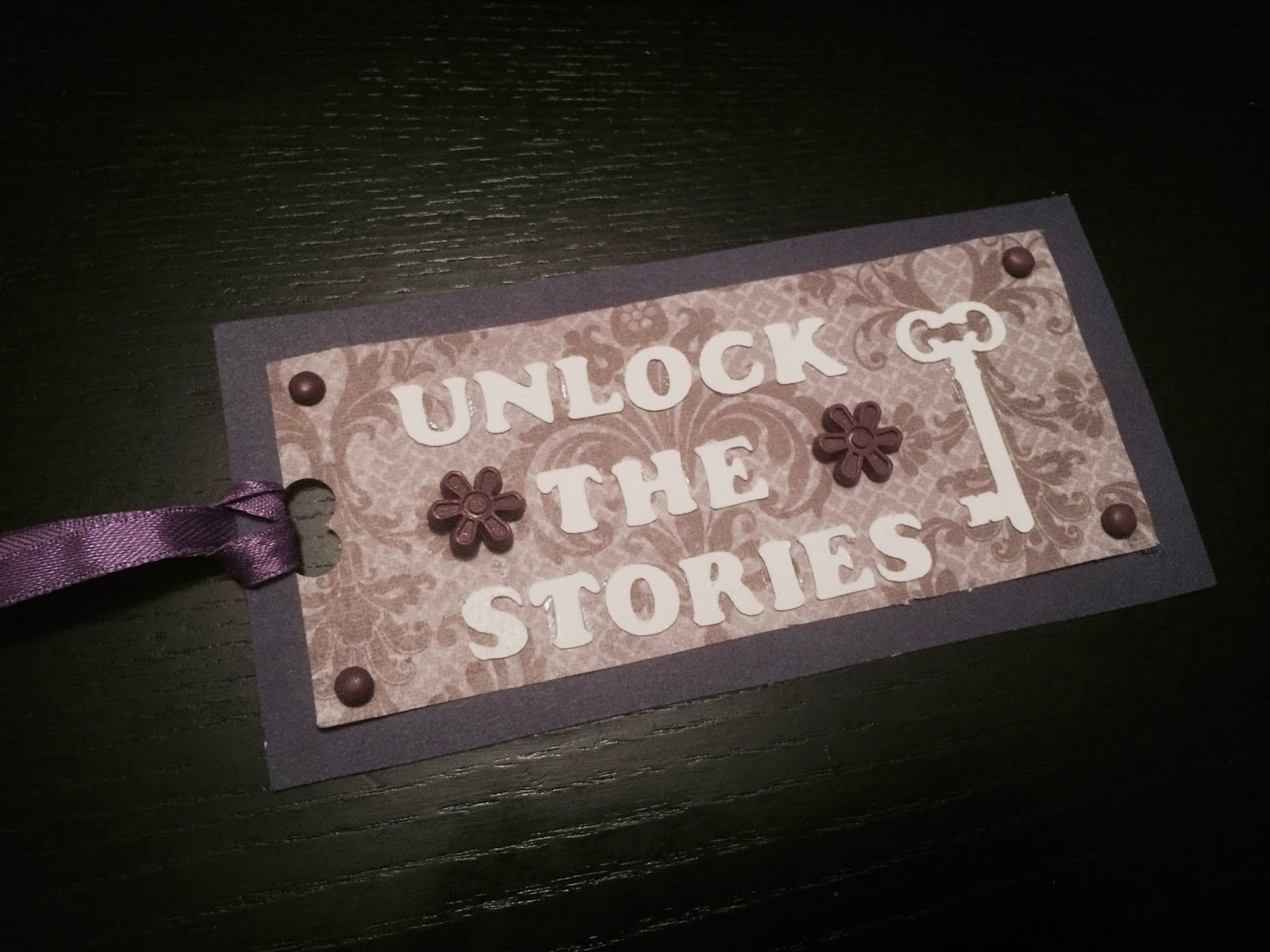 Step 3: Finishing touches. To complete this bookmark I used 2 flower embellishments. Apply your BGE to the back of your embellishment and let dry clear. Once clear, attach your embellishment to your project. Using a hole punch to punch a hole or a box cutter knife to make a small slit through your project and thread your piece ribbon through it. Tie a loose knot in your ribbon to secure it so it does not slip back out of the hole.