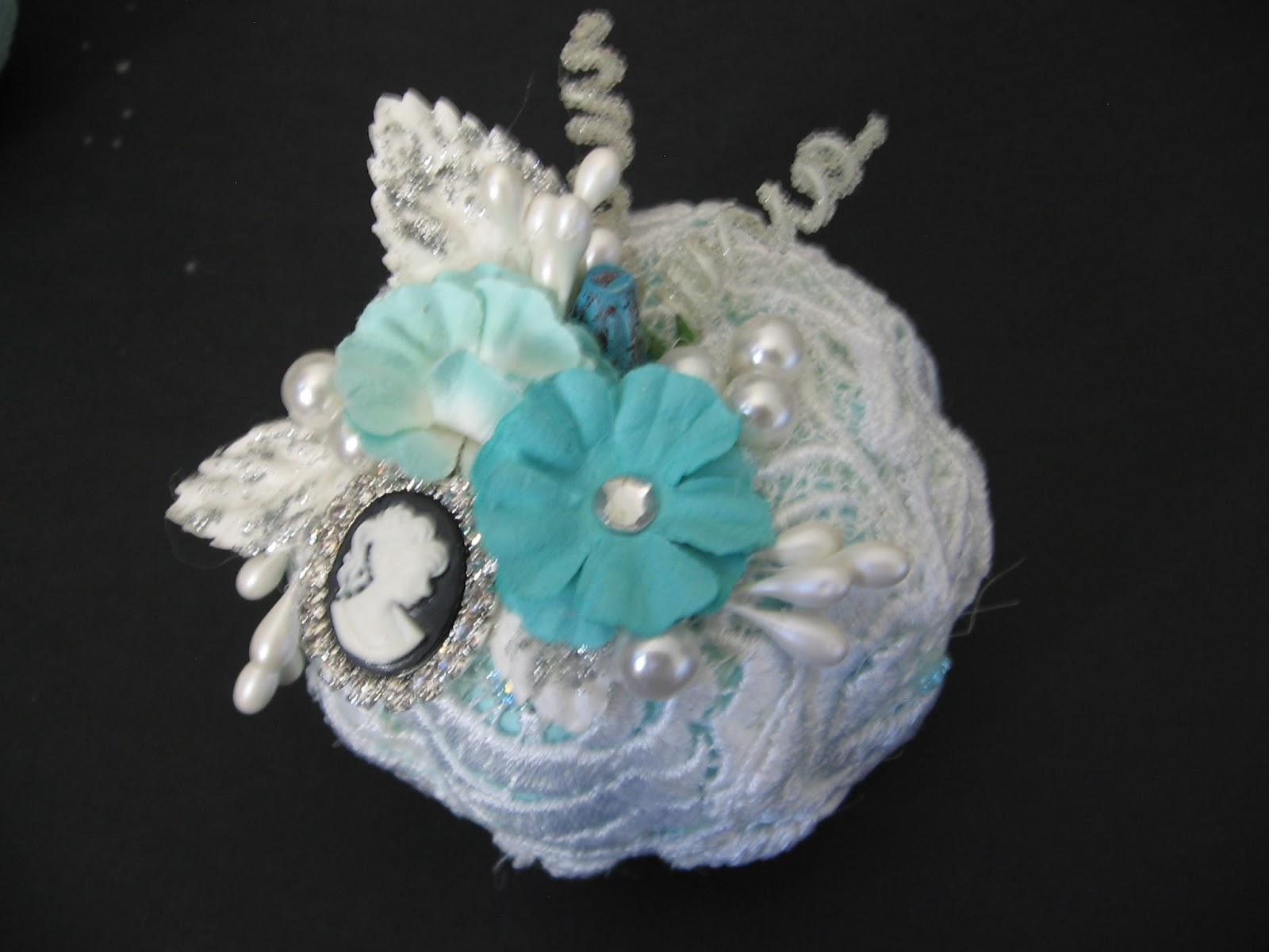 I decorated this one with some flowers, stamens and a lovely blingy cameo from Shabby is Chic Boutique which finished it off nicely.