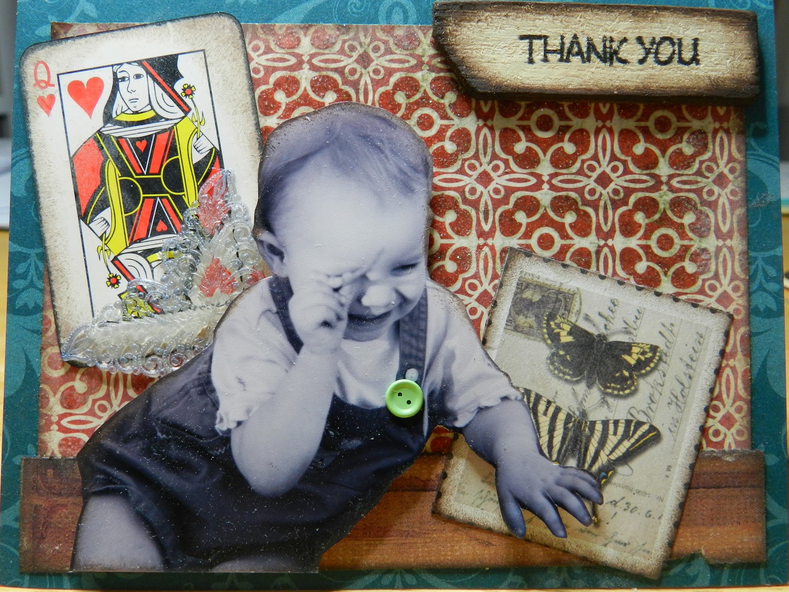 First for family members’ birthday thanks. Now that my daughter is 13 and almost grown up, I thought it would be cute to use some duplicate pictures I have of Jayn when she was little. I’ve already scrapped them, so I didn’t mind cutting these up. I have some tiny button brads, which look sweet on Jayn’s little jumper.