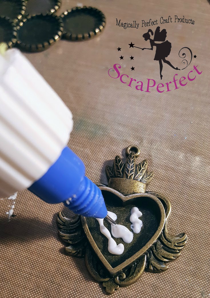 In addition to the ScraPerfect products, you will need your choice in bezel style metal pendants. I chose extra small bottle cap pendants & a decorative bezel pendant with an acrylic lens cover, all in antique brass finish. You will also need flat back floral resin or clay embellishments.