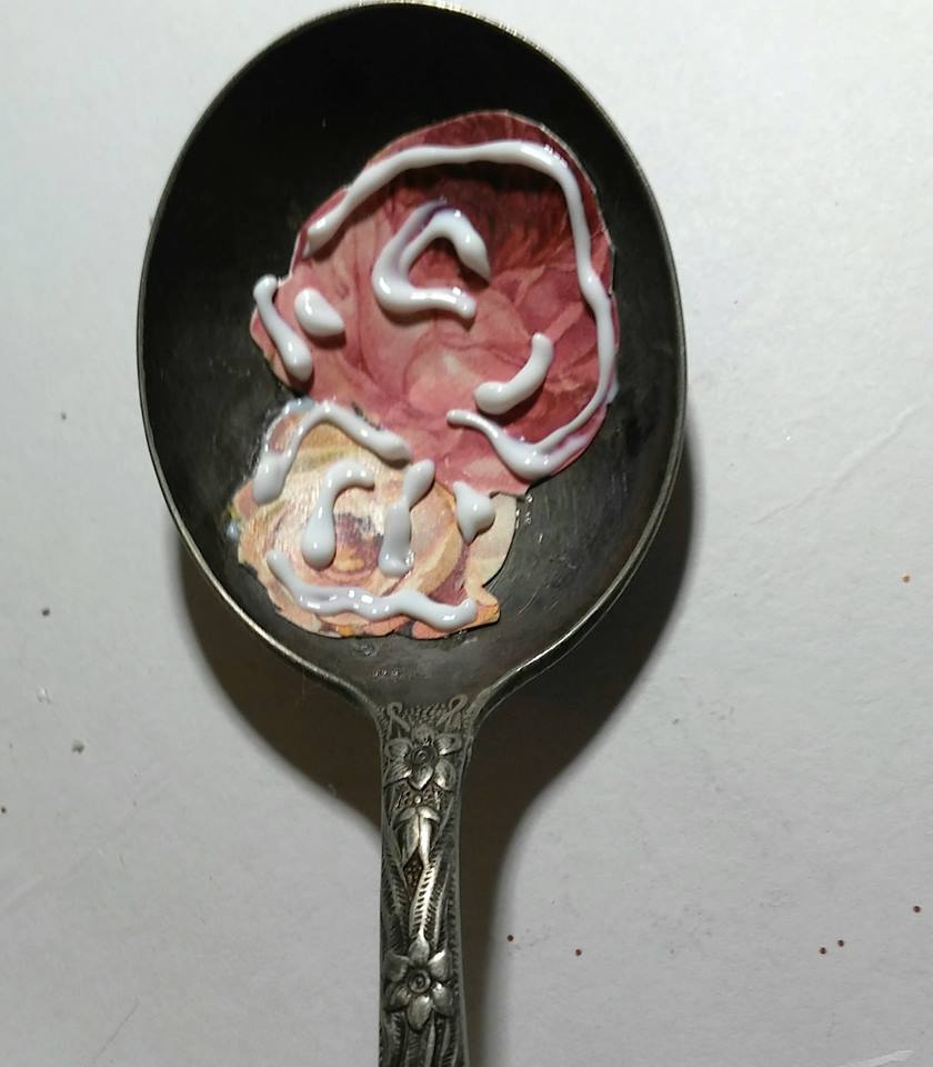 I started by taking some Prima paper and fussy cutting some roses. I applied some of the Best Glue Ever, using a bit more than I thought needed, since it had to bond to metal. I then waited until the glue was clear before attaching to the spoon, about 5 minutes.