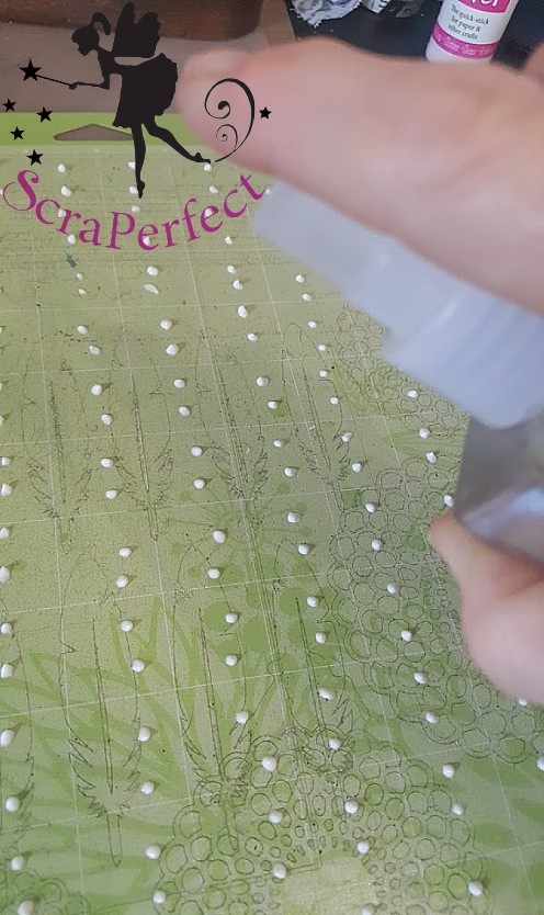 I then lightly spritzed the entire mat LIGHTLY with water, and proceeded to spread the dampened glue over the entire grid surface of the mat using my silicone craft tool.