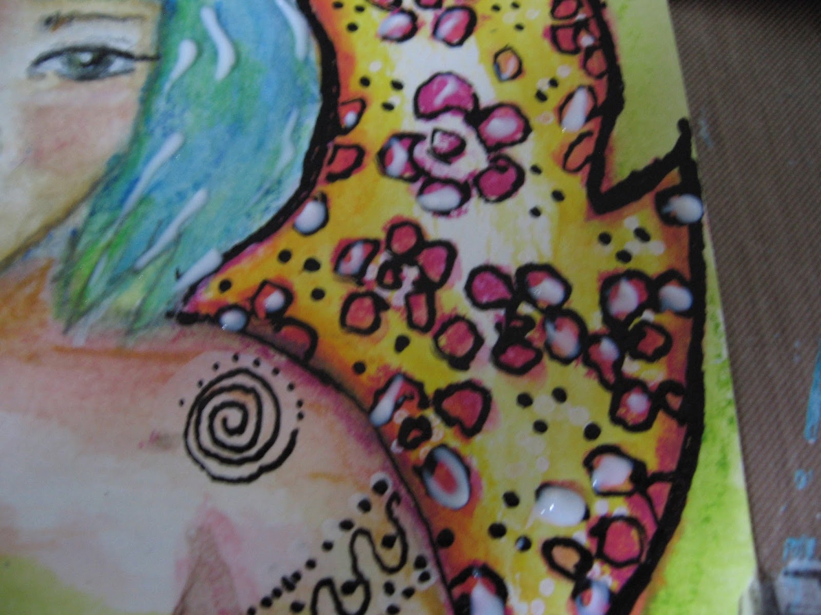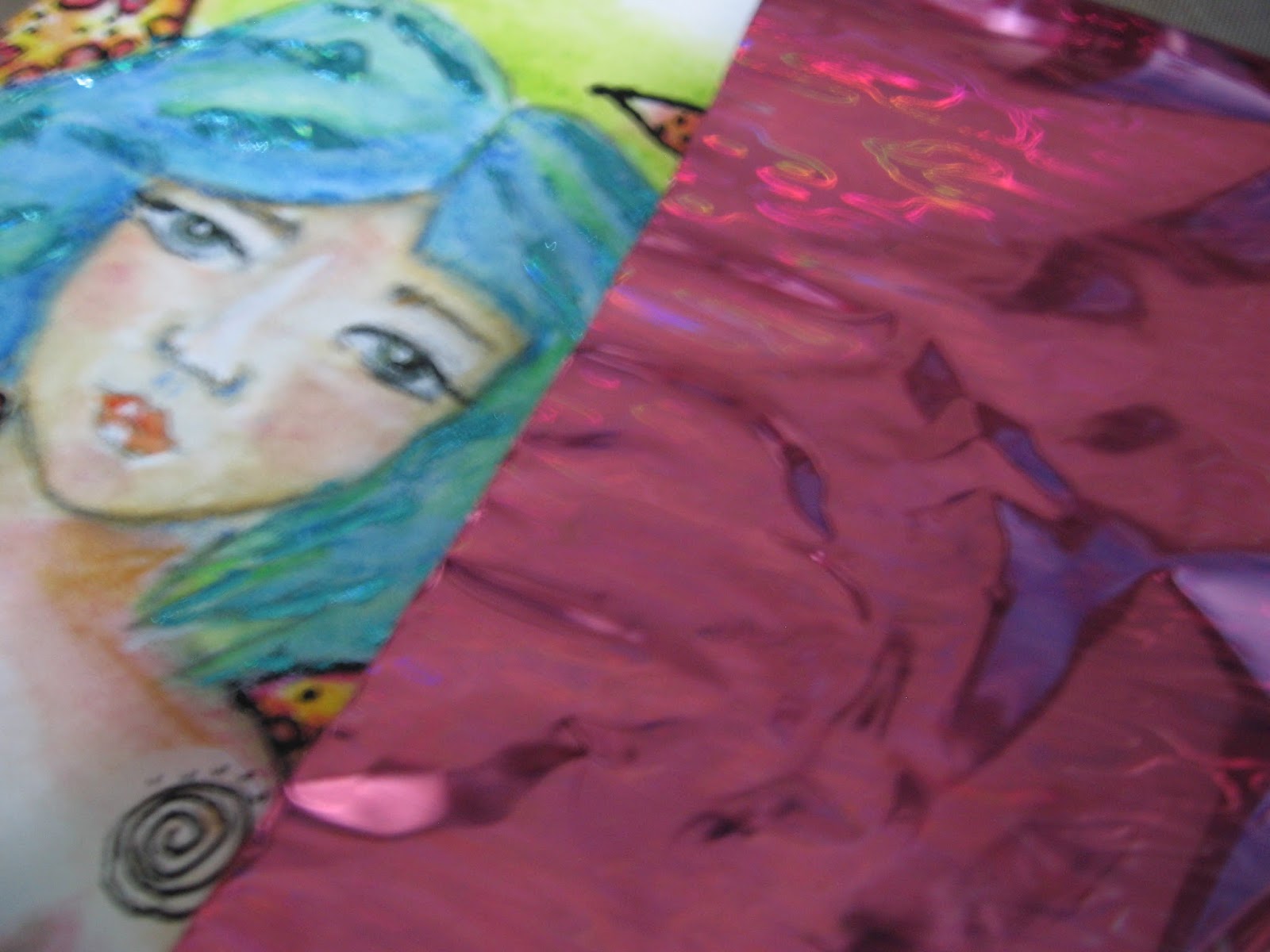 Once the glue was dry, it was time for the foil. I used the Crimson Rain on the wings, and the Turquoise Rain on her hair.