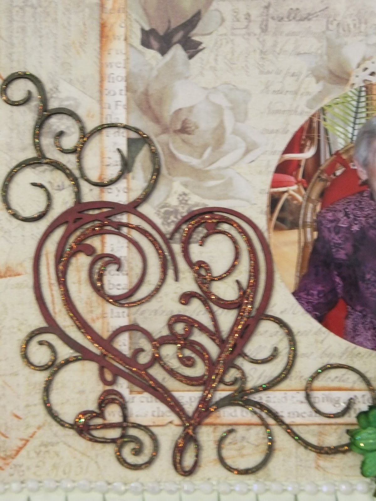 Another accent is a small cluster of flowers with a flourish chipboard accent. And notice the border of pleated lace.