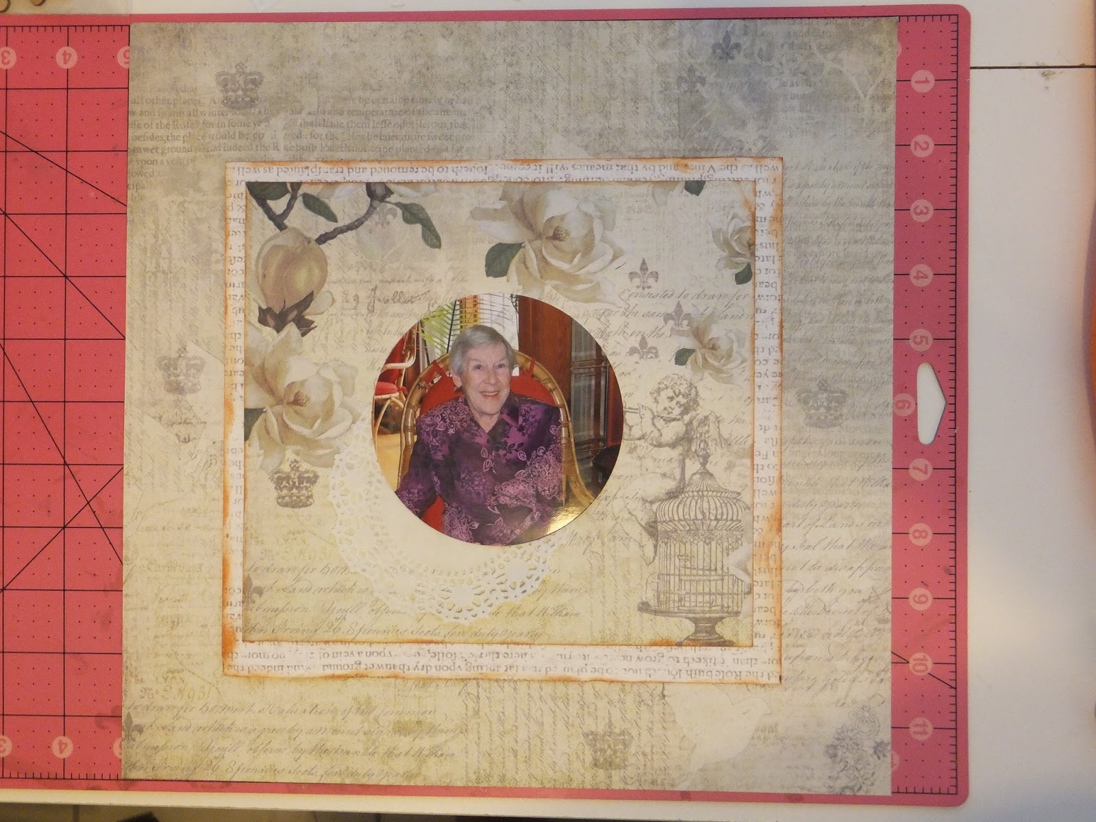 In the close ups you get  a better view of some of the details. Notice behind the photo I added a doily with inked edges. I also added sparkle to the butterfly.  There is a tattered rip in the upper edge of the paper and  the same gel dots are added.