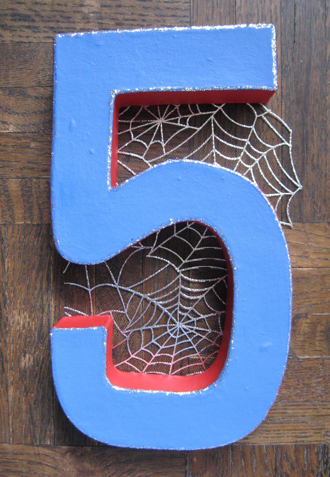 7. Embellish the #5 with a large Super Hero image to the left side slightly overhanging the edge. Finally, use the Best Glue Ever to attach the chipboard letters of the birthday boy’s name across the top.