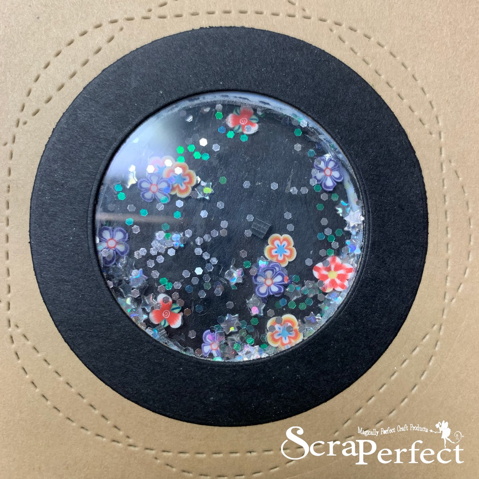 For the acetate panel, I cut it to size, glued it on the reverse side of the panel. I wiped it with the Perfect Cleaning Cloth to remove any oils from my fingerprints and gave it a once-over with the ScraPerfect Crafting Pouch which ensured that there wasn’t any static “sticking” the embellies to the acetate.