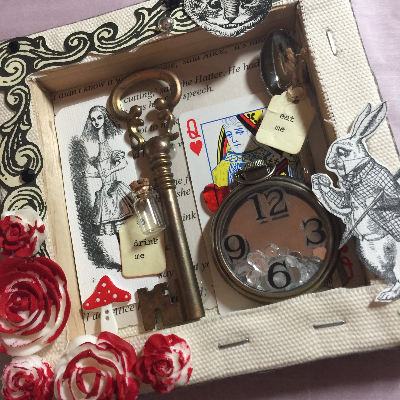 Hello and welcome to our crafty world today! Shelly here sharing a mixed media canvas / collage piece based on my favorite books…..Alice in Wonderland and Through the Looking Glass…
