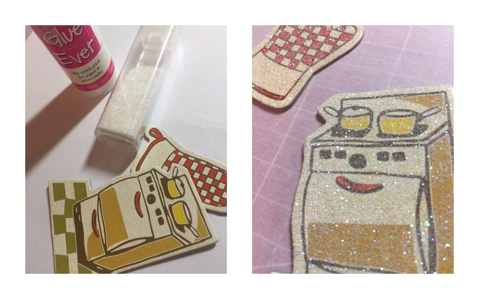 I wanted to add a little sparkle to my chipboard elements. I mixed a small amount of Best Glue Ever and a dash of water to thin it just a bit. Using my fingertip, I rubbed the glue over my chipboard pieces, covered with glittered and tapped off excess. Once the pieces were dry, I used the Perfect Cleaning Cloth to rub off any excess / loose glitter.