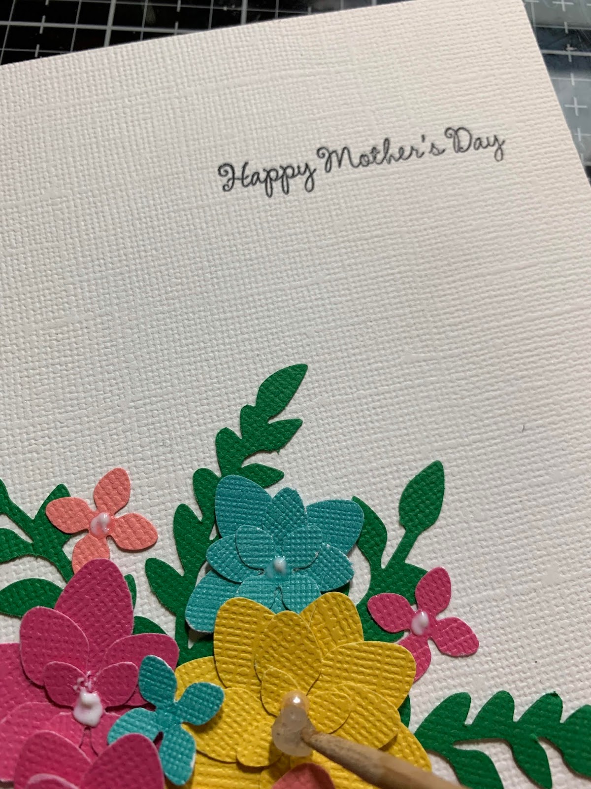 Pick up flower pieces using Embellie Gellie and apply a tiny bit of the Best Glue Ever! Applying a tiny bit is super easy with the No-clog Writing Tip!