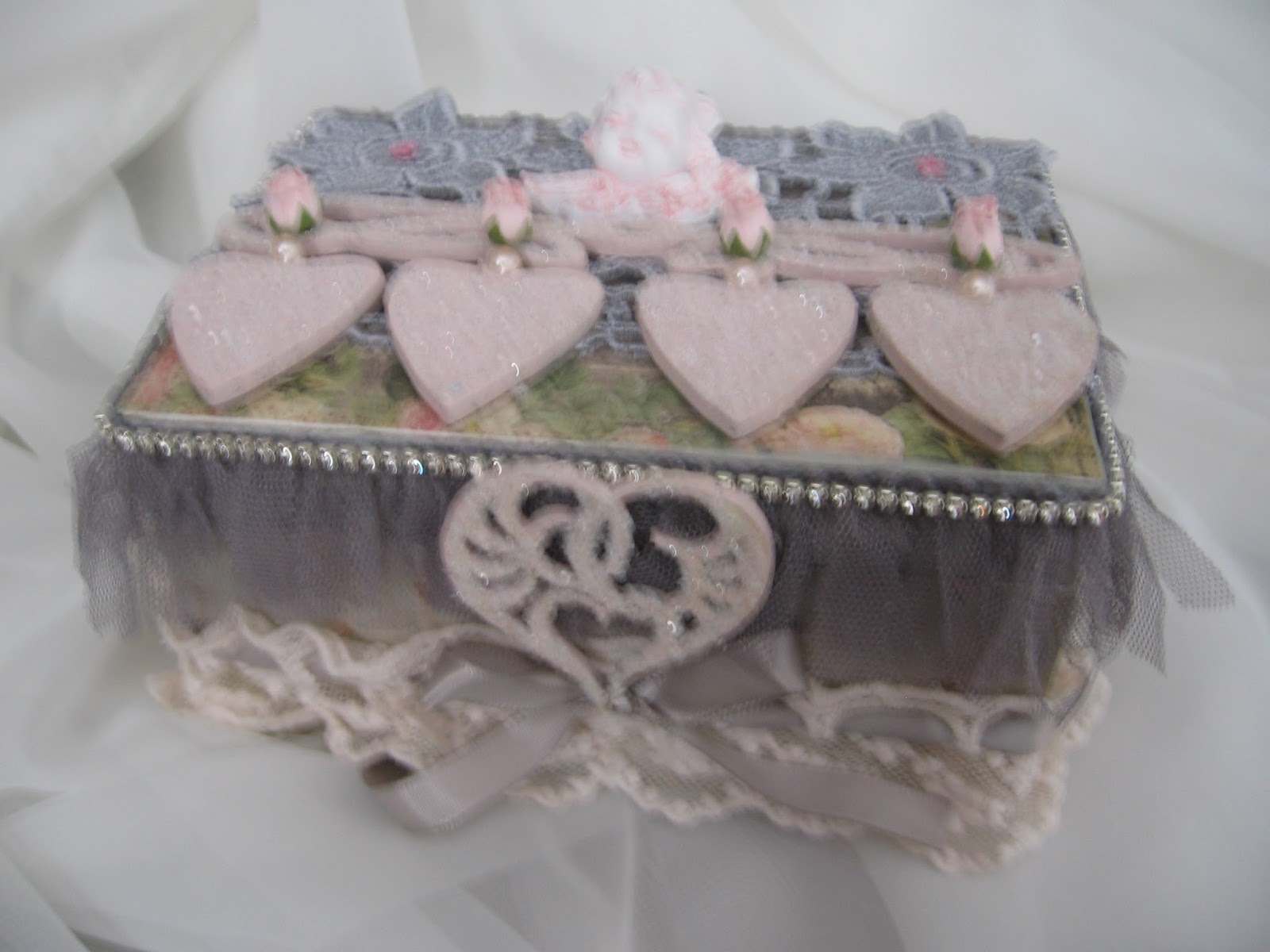 I glued the hearts on the box and also added some trims in a soft grey colour.