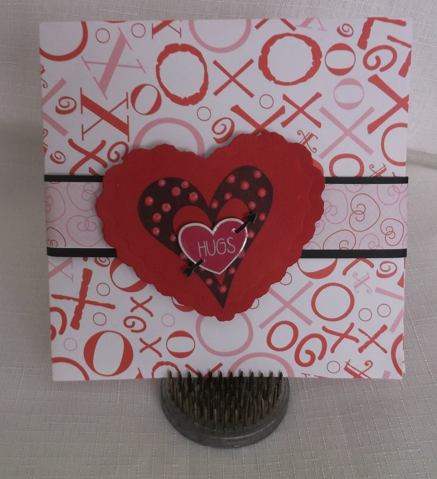 When I went to make the card I ran into a problem. You need 1 piece of double sided paper and I didn’t have any suitable for Valentine’s Day cards. I thought no problem, I’ll just adhere 2 pieces of single sided paper together. Have you ever tried that? Don’t bother! I tried to use my ATG gun and it was a nightmare trying to line up the 2 pages evenly….it just doesn’t work. Then I saw my bottle of the Best Glue Ever and it just clicked. I drew a small bead of the Best Glue Ever around the edges of one piece of single sided paper and laid the other piece of single sided paper on top and was able to line up the edges perfectly. The glue gave me the time I needed to line everything up easily. I also used some of the Best Glue Ever to make the layered belly band to go around the card. That glue is just amazing….I don’t know how I ever managed without it!