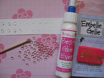 3. Use BGE to create a row of glue dots on release paper. When the glue has dried, place a gem on each glue dot. Use the Embellie Gellie tool to quickly and efficiently move the gems to the glue dots. It turns a normally fiddly job into a breeze.